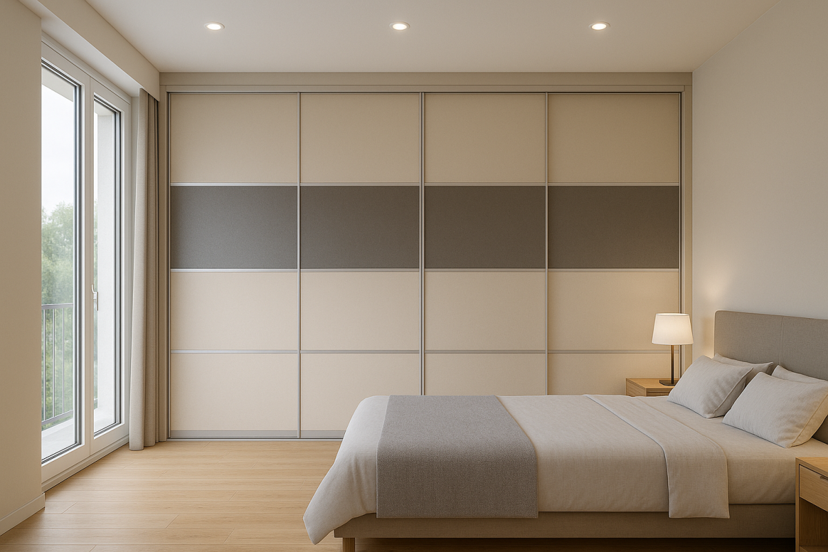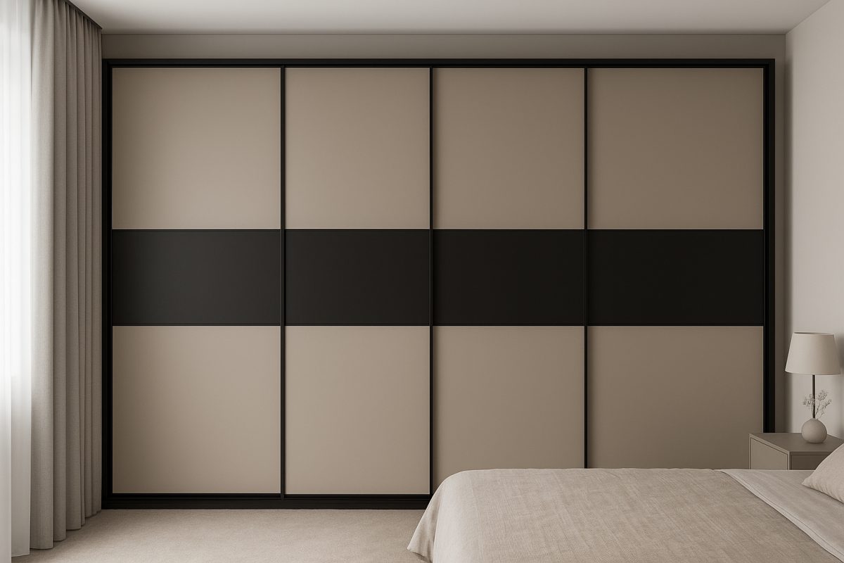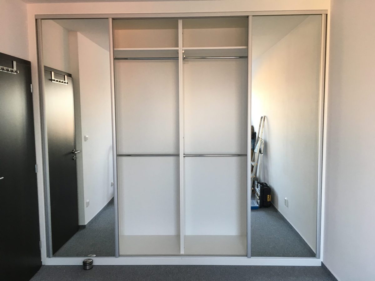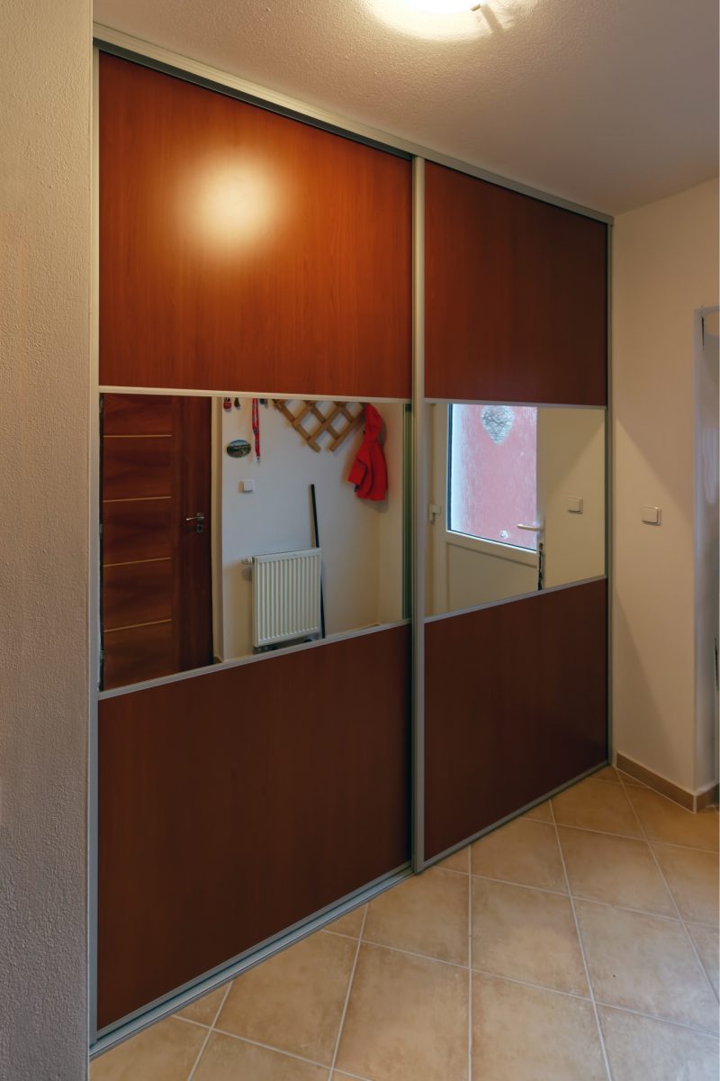 Dnes už téměř nejčastěji používaný typ skříní, díky posuvným dveřím není potřeba velkého prostoru před skříní, je tedy možné skříně instalovat i do menších místností.